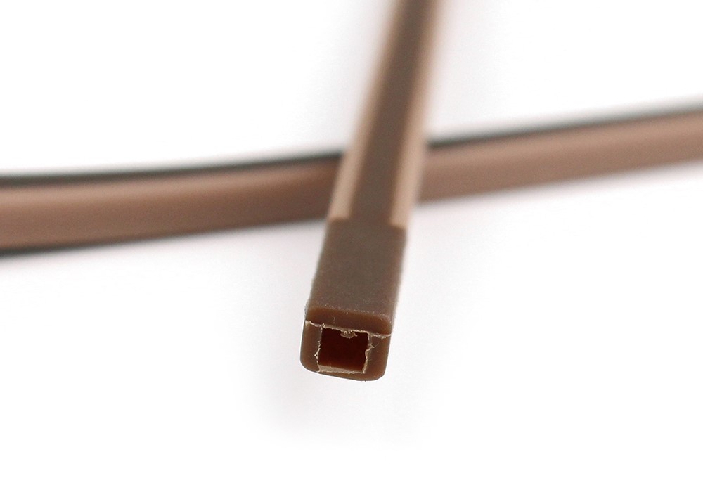 Miękkie silikonowe końcówki zauszników do opraw z zawiasem prostokątnym.