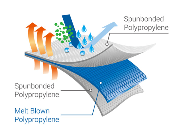 Materiał kompozytowy SMS ma bardzo dobre właściwości hydrofobowe (krople wody tworzą menisk na powierzchni), stanowi barierą dla płynów i cząsteczek zanieczyszczeń.